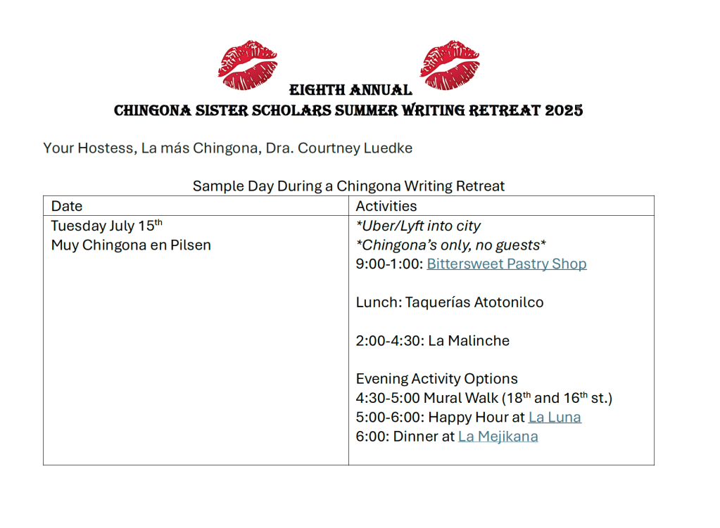 Since 2018, Dra. Luedke has participated in and has planned three Chingona Sister Scholar Retreats. These weeklong retreats include sisterhood, writing, and restorative activities. Please see below for a sample one day itinerary from the summer 2025 retreat she planned.